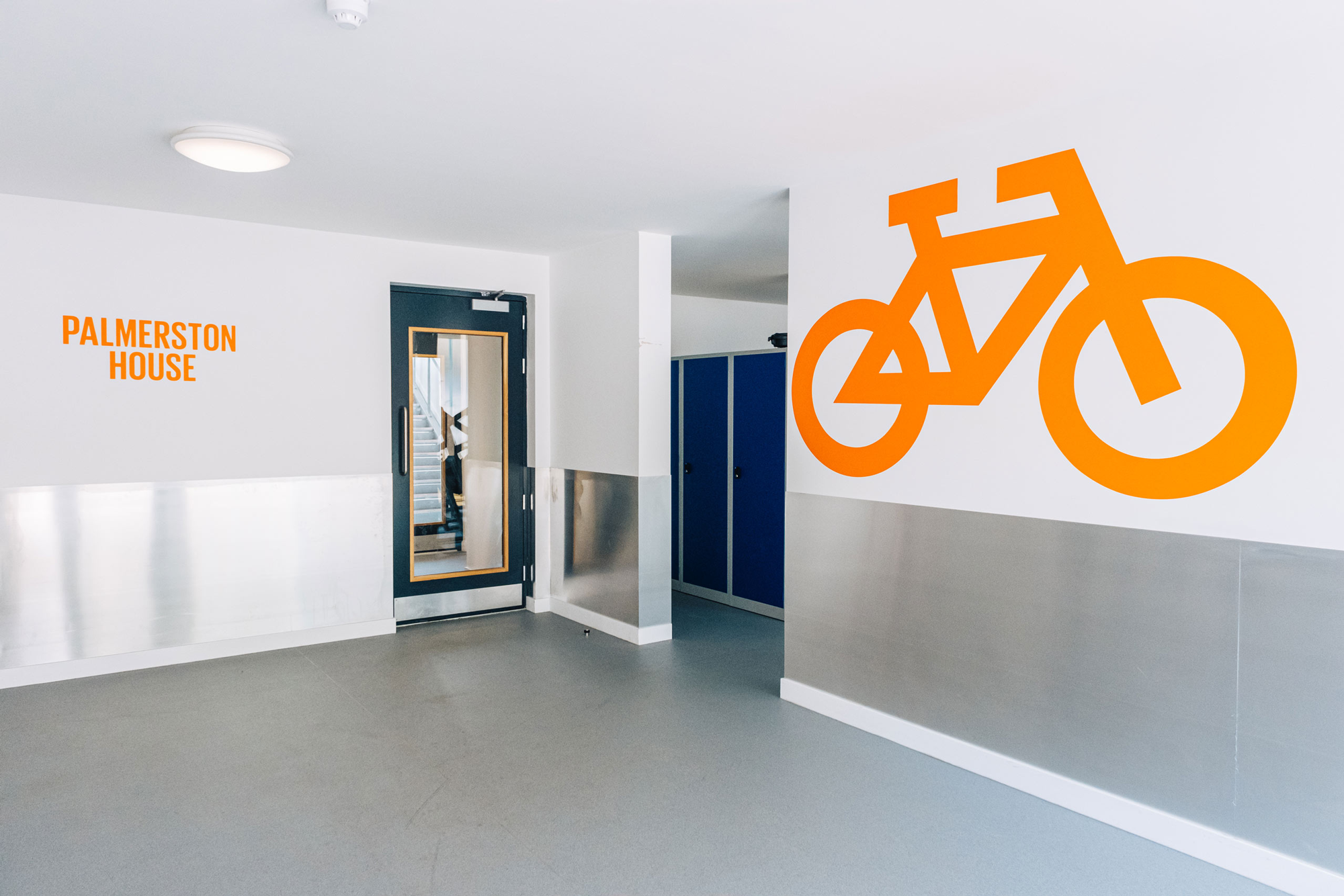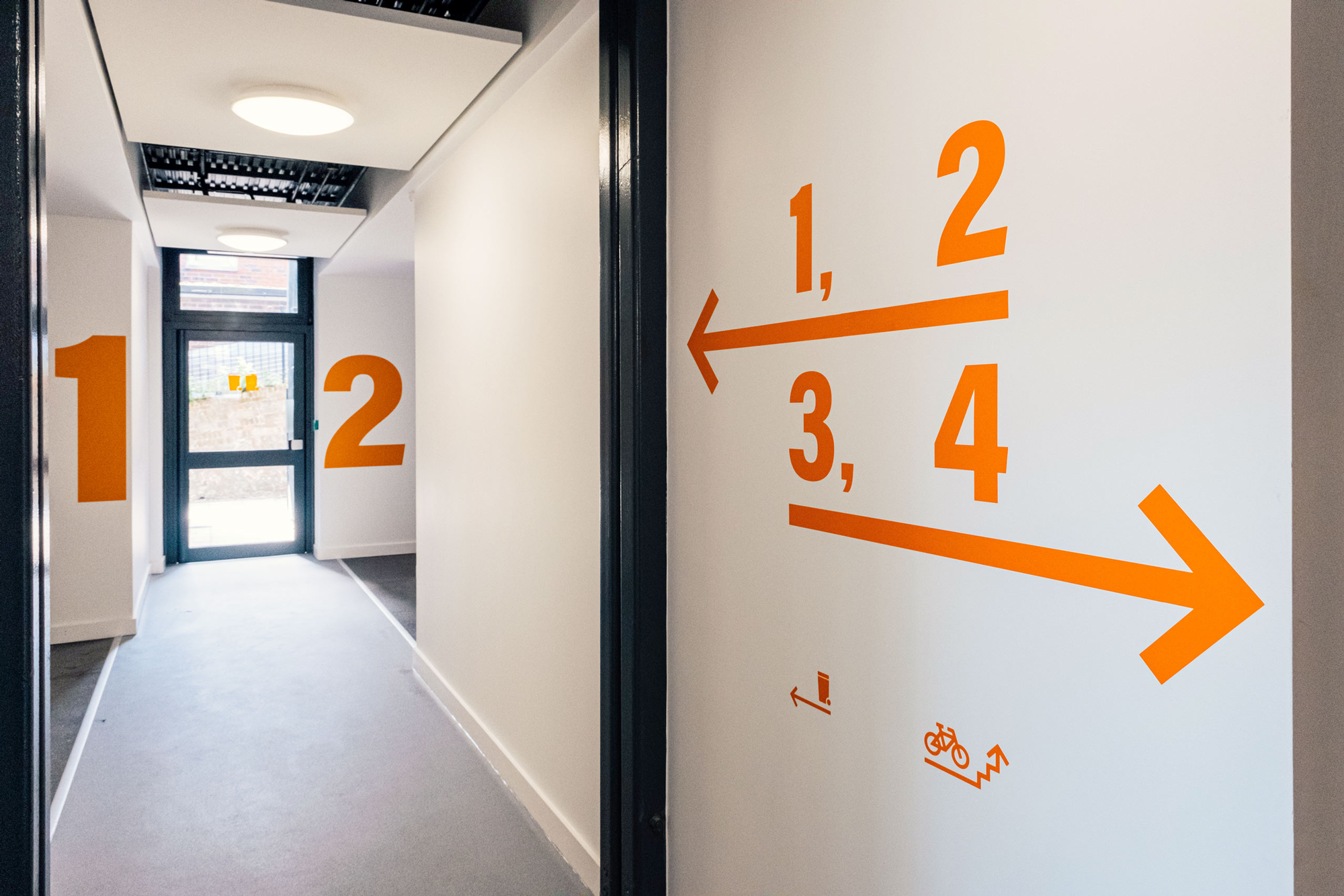 For Palmerston House we utilised the uniformity of the inside spaces, we designed oversized numbering for each flat that would be visible from the entrance to each floor. We chose a combination of Corten Steel and a bright orange vinyl to link to the industrial heritage of the site.