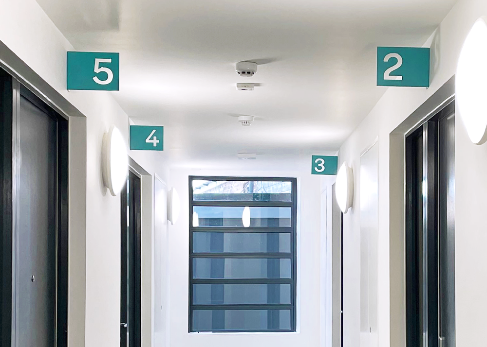 We designed laser cut bus stop signs for the flats so the flat numbers are visible when looking down the corridor, we used a combination of laser cut metal and vinyls throughout.